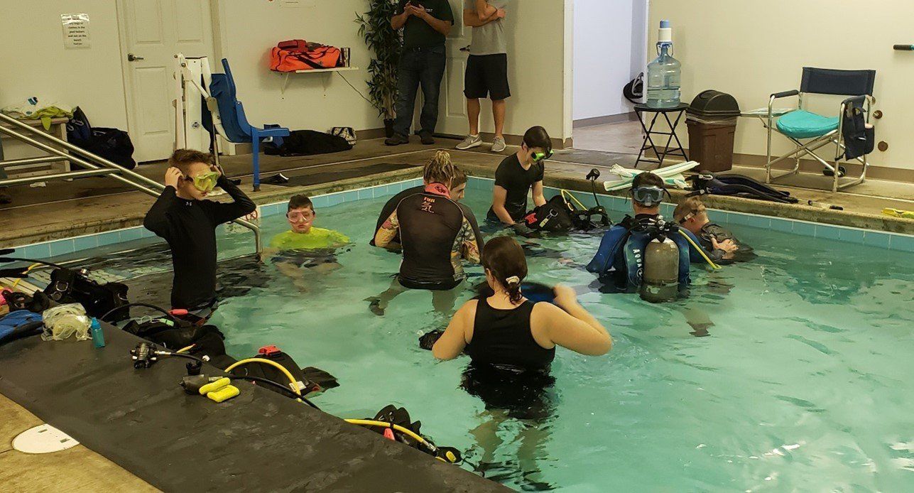 The moved from the shallow end of the pool to the deeper end, learning what to do and what not to do when scuba diving.