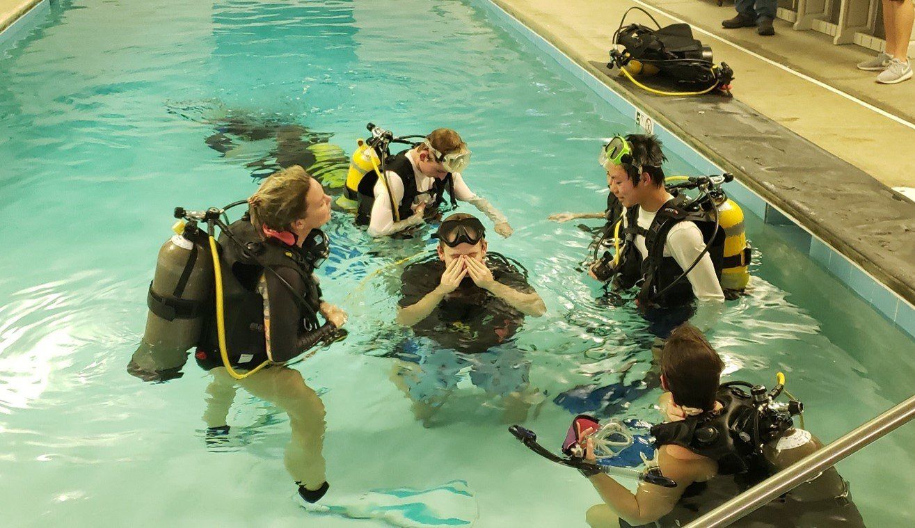 The moved from the shallow end of the pool to the deeper end, learning what to do and what not to do when scuba diving.